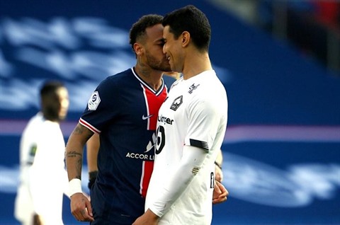| L'attaquant brésilien du PSG Neymar et le milieu de terrain de Lille Benjamin André, le 3 avril au Parc des Princes. |