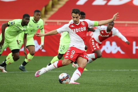 | L'attaquant de Monaco Wissam Ben Yedder frappe un penalty contre Dijon, le 11 avril au stade Louis-II. |