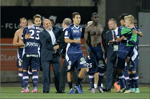 | L'entraîneur d'Evian, Pascal Dupraz, félicité ses joueurs après leur victoire, 2-0 face à Lorient, lors de leur match de L1, le 27 septembre 2014 au Stade du Moustoir. |