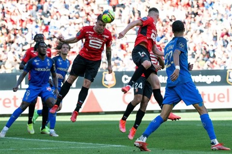 | Flavien Tait prend le ballon de la tête lors de la rencontre de Ligue 1 entre Rennes et Reims le 12 septembre à Rennes dans le cadre de la 5e journée de Ligue 1. |