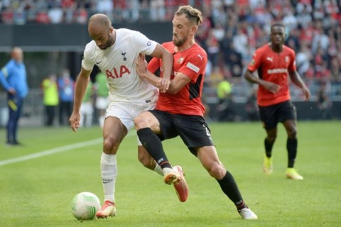 | Flavien Tait presse Lucas Moura lors de la rencontre entre Rennes et Tottenham dans le cadre de la première journée de Ligue Europa Conférence jeudi 16 septembre à Renne. |