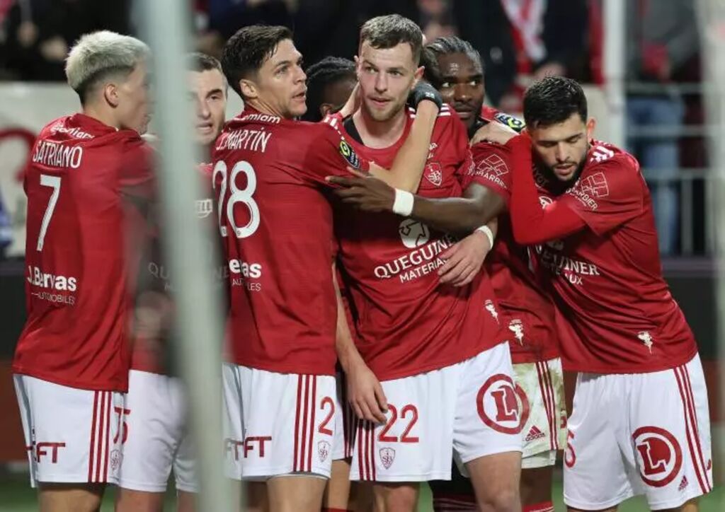 | Les Brestois célèbrent le premier but de Pierre Lees-Melou lors du match de football de L1 entre le Stade Brestois et l’Olympique de Marseille au stade Francis-Le Ble à Brest, le 18 février. |