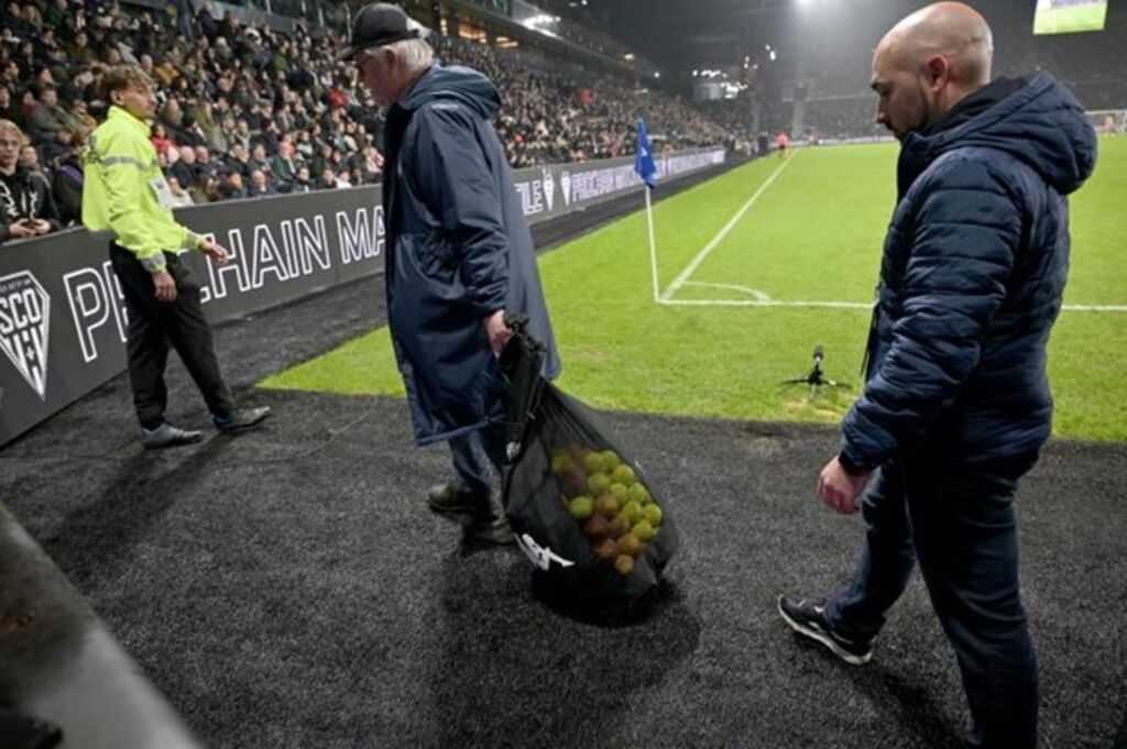 | Le personnel du stade du SCO d'Angers ramasse les balles de tennis lancées sur le terrain par les supporters lors de la rencontre avec le PSG au stade Raymond-Kopa d'Angers, le 9 novembre. |