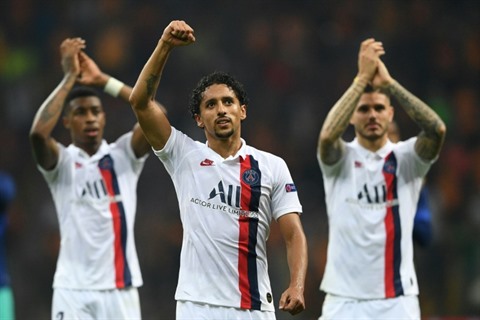 | Le défenseur du PSG, Marquinhos (centre), et ses coéquipiers en liesse après leur victoire face à Galatasaray en C1, le 1er octobre à Istanbul. |