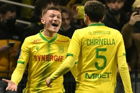 | Le Nantais Quentin Merlin (gauche) vient de marquer le second but de son équipe contre le PSG, le 19 février au stade de La Beaujoire. |