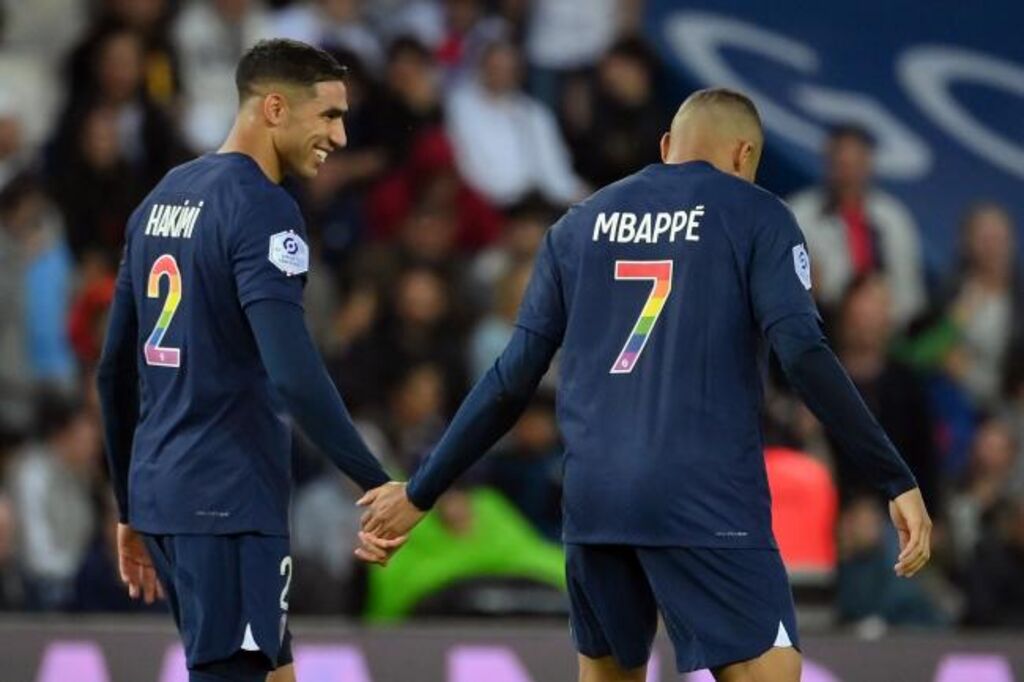 | Le défenseur marocain Achraf Hakimi (gauche), exclu par la suite, et l'attaquant français Kylian Mbappé, ont inscrit trois des cinq buts du Paris SG le 13 mai contre Ajaccio. |