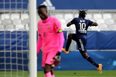 | L'attaquant nigérian Samuel Kalu (droite) marque le 2e but de Bordeaux lors du match de Ligue 1 à domicile contre Dijon, le 4 octobre. |
