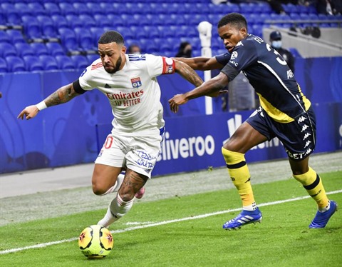 | L'attaquant de Lyon, Memphis Depay (gauche), échappe au milieu de Lyon, Florentino Luis, le 25 octobre à Décines-Charpieu. |