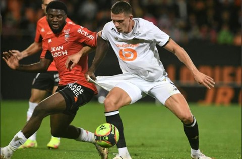 | Le Lorientais Terem Moffi (gauche) et le Lillois Sven Botman au duel, le 10 septembre 2021 au Moustoir, vont devoir attendre pour s'affronter en match retour. |