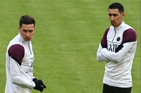 | Le milieu de terrain allemand du Paris Saint-Germain, Julian Draxler, et l'attaquant argentin Angel Di Maria, au camp d'entraînement du club, le 6 avril 2021. |
