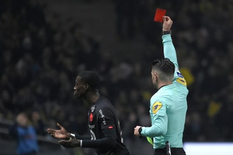 | L'arbitre Pierre Gaillouste adresse un carton rouge à l'attaquant de Lille, Timothy Weah, lors du match à Nantes, le 19 mars. |