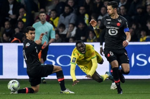 | L'attaquant de Nantes, Randal Kolo Muani (centre), pris entre les Lillois Benjamin André (gauche) et Jose Fonte, le 19 mars à Nantes. |