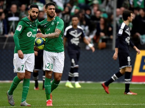 | Le milieu algérien de Saint-Étienne, Ryad Boudebouz (gauche), félicite l'attaquant gabonais Denis Bouanga (droite) pour son but face à Bordeaux, à Geoffroy-Guichard, le 8 mars. |