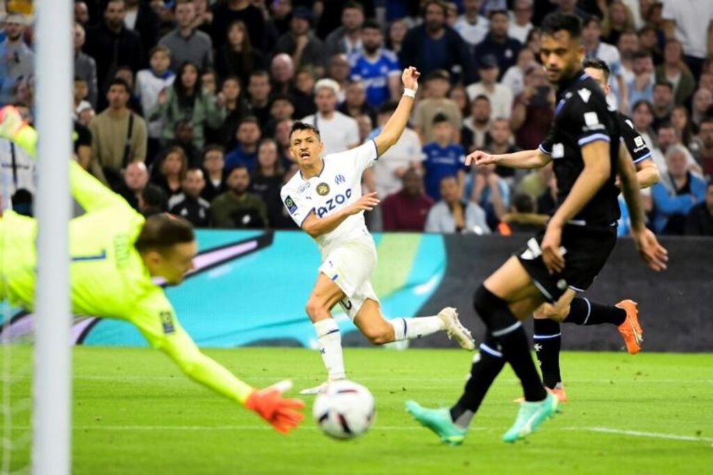 | L'attaquant marseillais Alexis Sanchez (centre) marque contre Auxerre, le 30 avril au stade Vélodrome. |