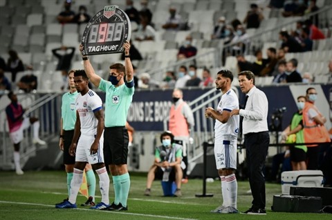 | L'entraîneur de Lyon, Rudi Garcia (droite) discute avec le milieu de terrain Houssem Aouar, lors du match de Ligue 1 entre l'Olympique lyonnais et les Girondins de Bordeaux, le 11 septembre à Bordeaux. |