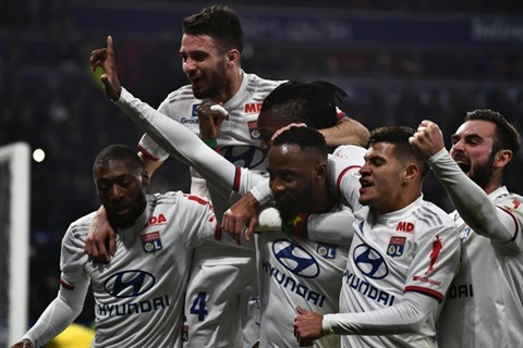 | La joie des joueurs lyonnais après le but du break signé Moussa Dembélé (bras levé) contre Saint-Étienne au Parc OL, le 1er mars. |