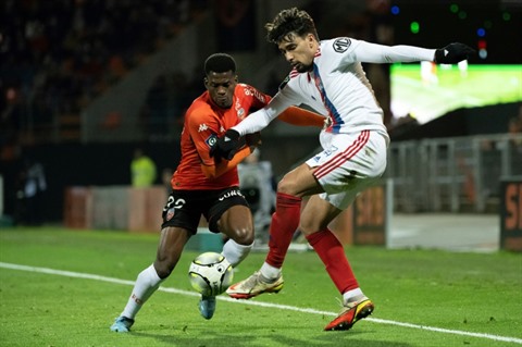 | L'attaquant de Lyon Lucas Paquetà (droite) à la lutte avec le défenseur lorientais Dango Ouattara, le 4 mars à Lorient. |