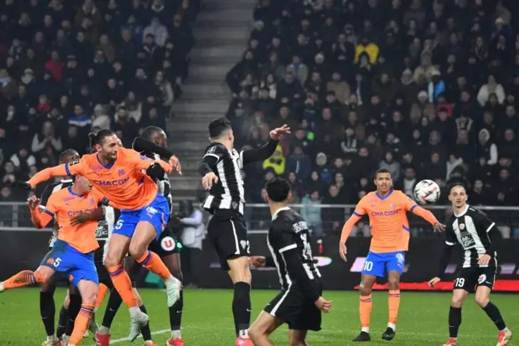 | Adrien Rabiot (en l'air à gauche) ouvre le score de la tête sur corner pour Marseille à Angers en L1, le 9 février. |