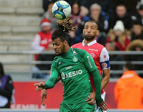 | L'attaquant de Saint-Étienne, Lois Diony (gauche), à la lutte avec le défenseur franco-marocain de Reims, Yunis Abdelhamid, lors du match de Ligue 1 à Reims, le 8 décembre. |