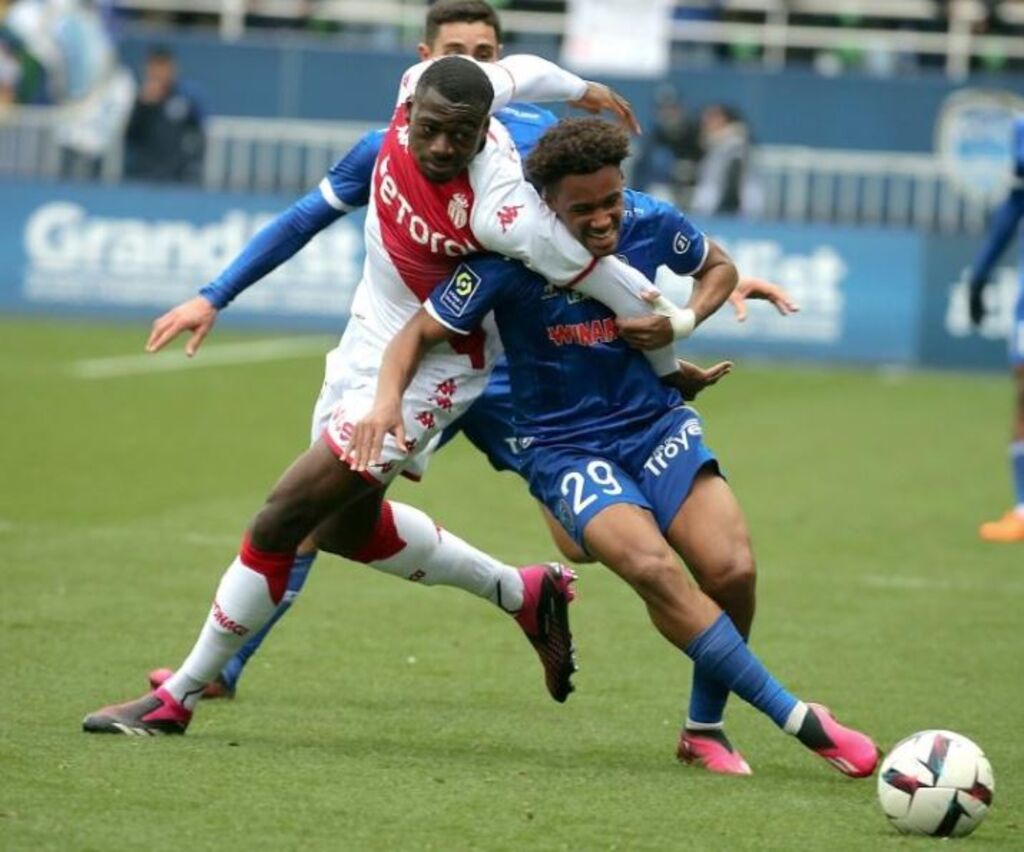 | Le milieu de terrain de Monaco, Youssouf Fofana (gauche), à la lutte avec l'ailier de Troyes, Wilson Odebert, le 5 mars au stade de l'Aube. |