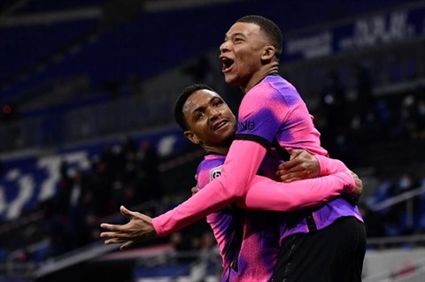 | La joie de l'attaquant du PSG, Kylian Mbappé, dans les bras du défenseur Abdou Diallo, après avoir ouvert le score face à Lyon, le 21 mars au Groupama Stadium à Décines-Charpieu. |