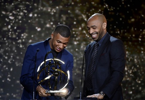 | L'attaquant Kylian Mbappé (g), avec le trophée de meilleur joueur de Ligue 1, aux côtés de l'ancien joueur Thierry Henry, lors de la cérémonie des Trophées UNFP, à Paris, le 15 mai 2022. |