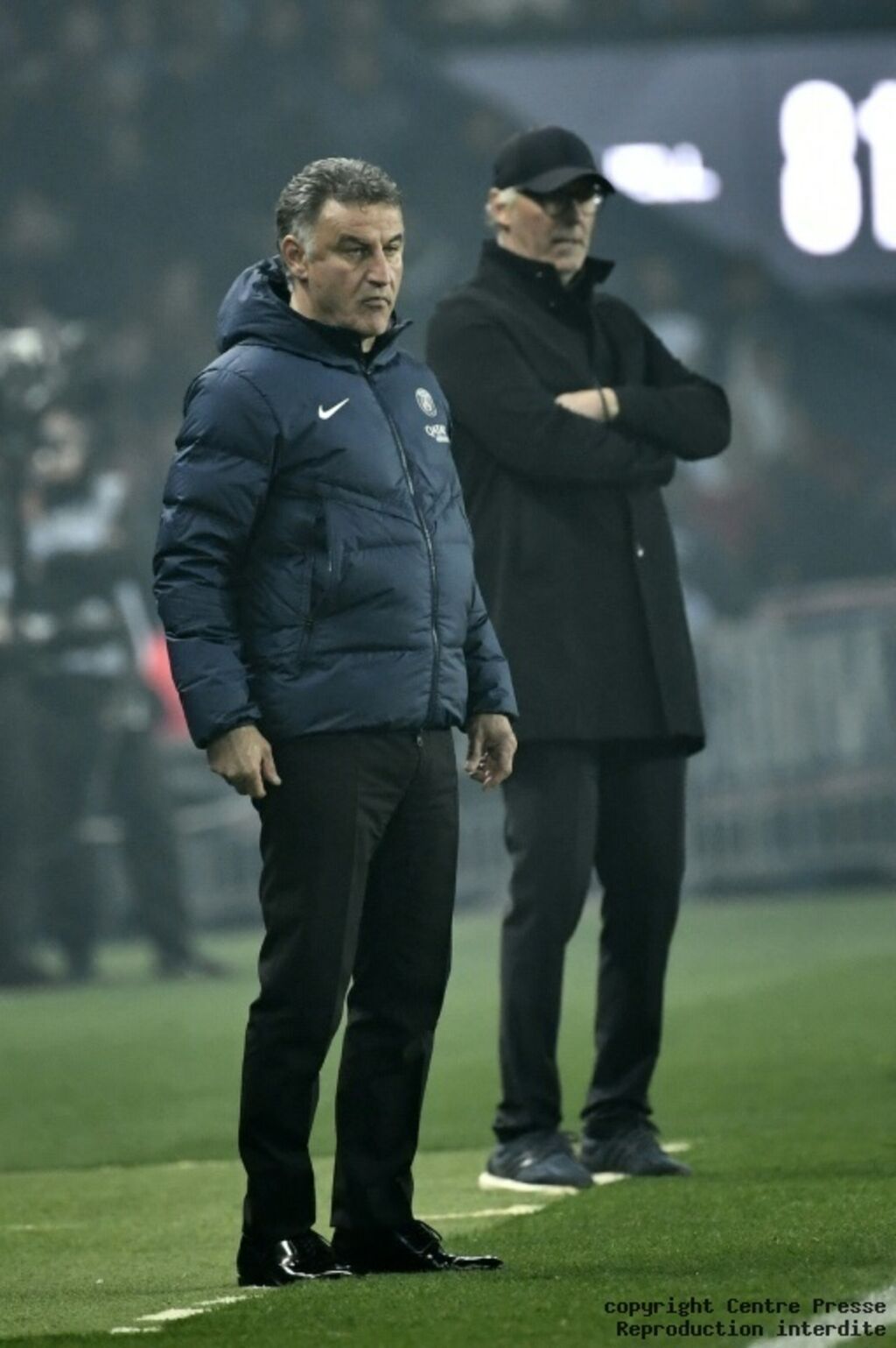 | L'entraîneur du Paris SG Christophe Galtier (gauche) et celui de Lyon Laurent Blanc, lors du match en Ligue 1 du Paris SG contre Lyon, le 2 avril à Paris. Photo : AFP/VNA/CVN |