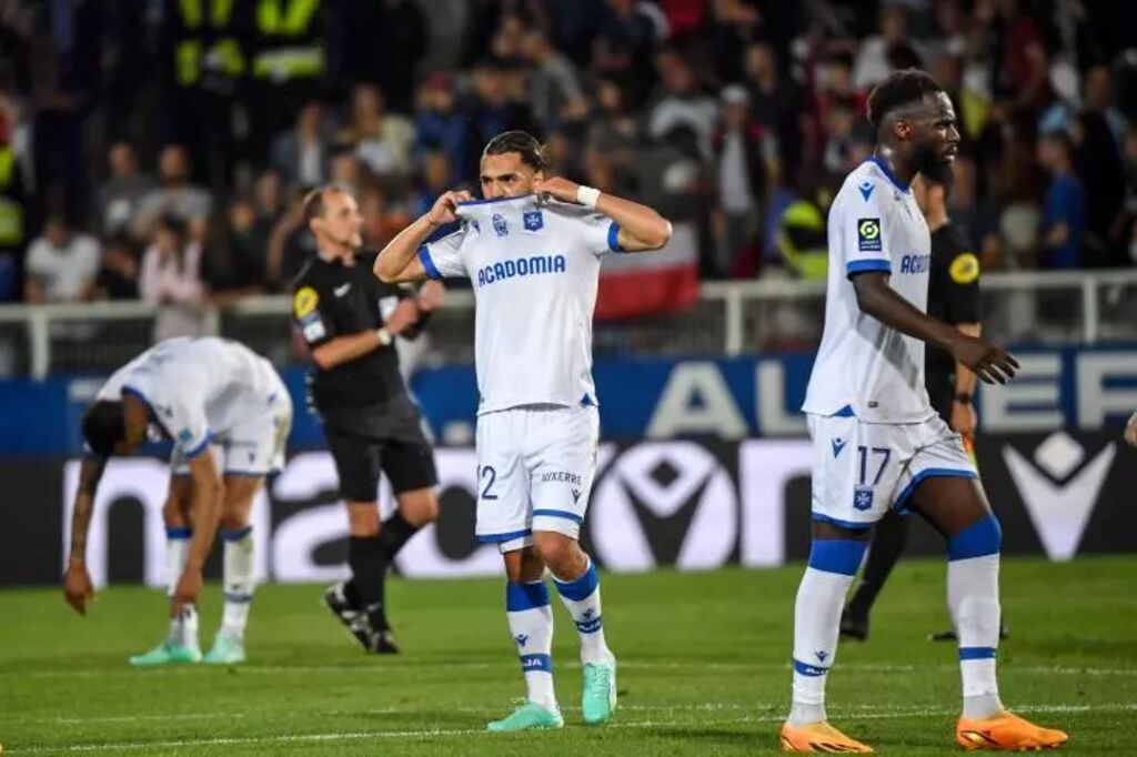 | Le dépit des Auxerrois et de Hamza Sakhi (centre), relégués en Ligue 2 après leur défaite contre Lens, le 3 juin. |