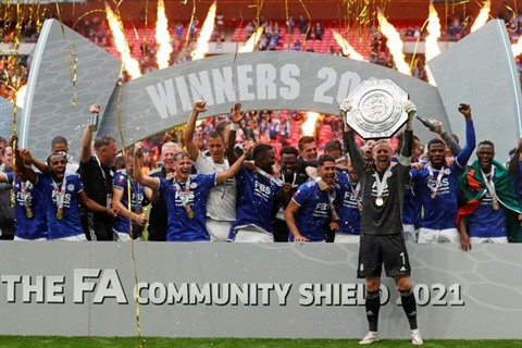 | Kasper Schmeichel soulève le trophée du Community Shield, après avoir remporté avec ses coéquipiers la finale face à Manchester City, à Londres. |