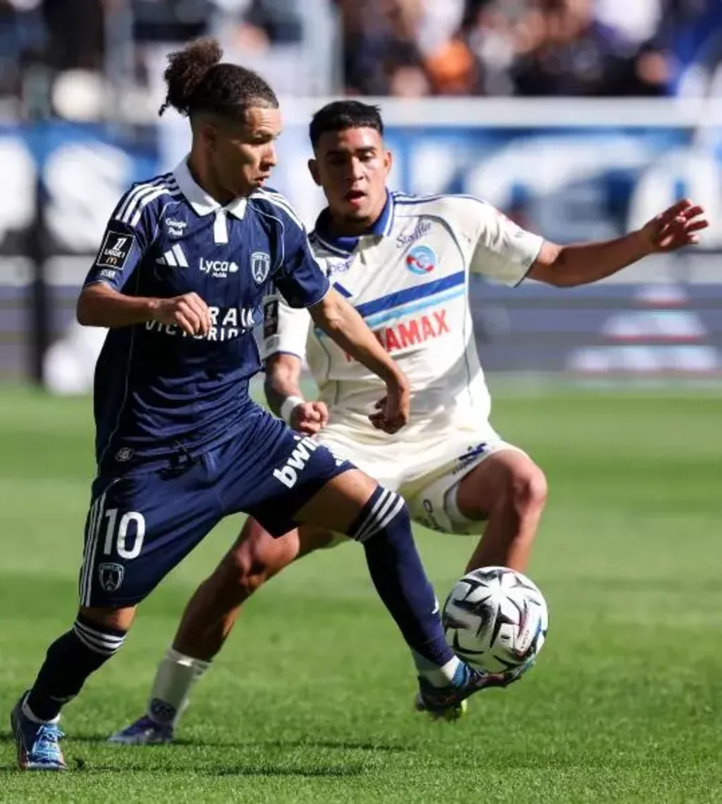 | Le milieu du club de football du RC Strasbourg Alsace Kendry Paez (droite) avec le joueur du Paris FC Ilan Kebbal lors du match de championnat de France de Ligue 1 entre les deux équipes au stade Jean-Bouin à Paris le 21 septembre. Photo : AFP/VNA/CVN |