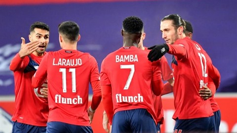 | Les Lillois se congratulent après le but de Yusuf Yazici contre Dijon, le 31 janvier au stade Pierre-Mauroy. |