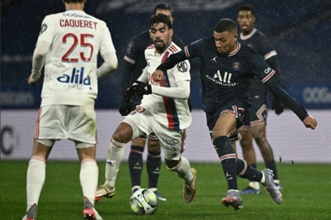 | La star Kylian Mbappé tente un débordement sur le Lyonnais Lucas Paqueta lors du match nul OL-PSG à Décines, le 9 janvier. |