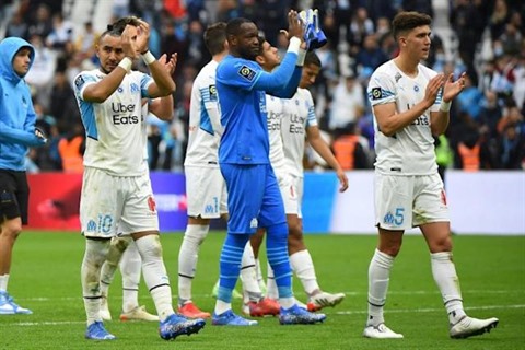 | Le milieu de terrain marseillais Dimitri Payet (gauche), le gardien Steve Mandanda et leurs coéquipiers, saluent leurs supporters, après leur match nul (0-0) à domicile contre Metz, le 7 novembre au Stade Vélodrome. |