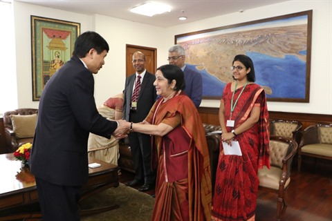 | Le vice-ministre vietnamien des Affaires étrangères Dang Dinh Quy reçu par la ministre indienne des Affaires étrangères, Sushma Swaraj. |