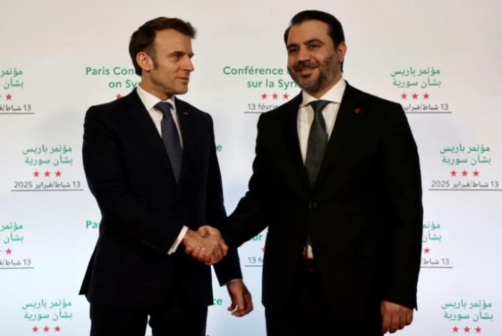 | Le président français Emmanuel Macron (gauche) et le ministre syrien des Affaires étrangères Assaad al-Chaibani, le 13 février à Paris. |
