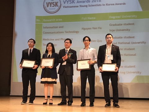 | Les jeunes scientifiques récompensés lors de l'ACVYS 2018, le 20 mai en République de Corée. |