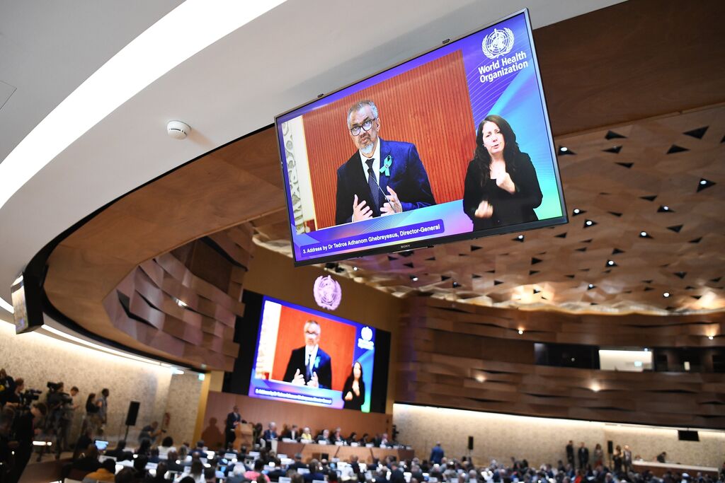 | Le directeur général de l'OMS, Tedros Adhanom Ghebreyesus, à la cérémonie d'ouverture de la 78e d'AMS, le 19 mai à Genève. |