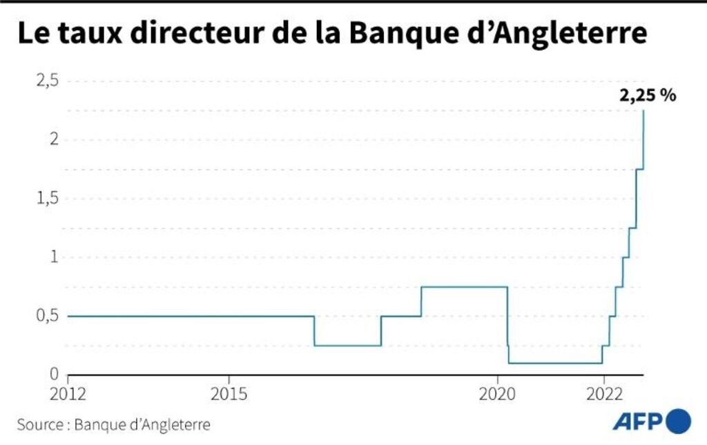 Le comité de politique monétaire (MPC) était partagé : sur neuf membres, "cinq ont voté pour une hausse de 0,50 point" à 2,25%, explique la BoE dans un communiqué, ce qui amène le taux à un sommet depuis 2008. La Banque estime en outre que l'inflation britannique va connaître un pic en octobre d'un peu moins de 11% sur un an, contre 13% prévus jusqu'à présent.