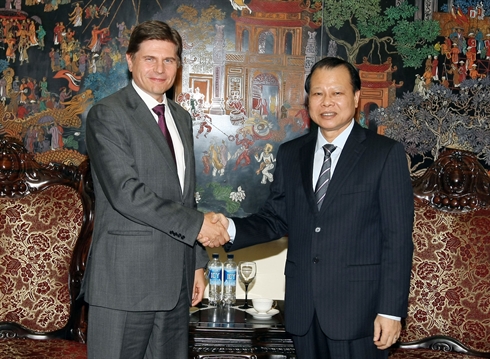 | Le vice-Premier ministre Vu Van Ninh (droite) et le président et directeur exécutif général de la Banque J.P. Morgan en Asie, Nicolas Aguzin, le 30 septembre à Hanoi. |