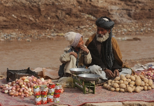 | Un vieux homme afghan et son fils vendent des produits alimentaires dans la ville de Herat en Afghanistan. |