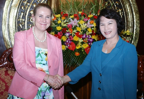 | La vice-présidente de l'Assemblée nationale Nguyên Thi Kim Ngân (droite) et la vice-présidente de la BM chargée d'Asie de l'Est et du Pacifique, Pamela Cox, le 25 juillet à Hanoi |