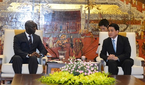 | Le directeur de la BM au Vietnam, Ousmane Dione, et le président du Comité populaire de Hanoï, Nguyên Duc Chung, lors de la rencontre du 12 mars. |
