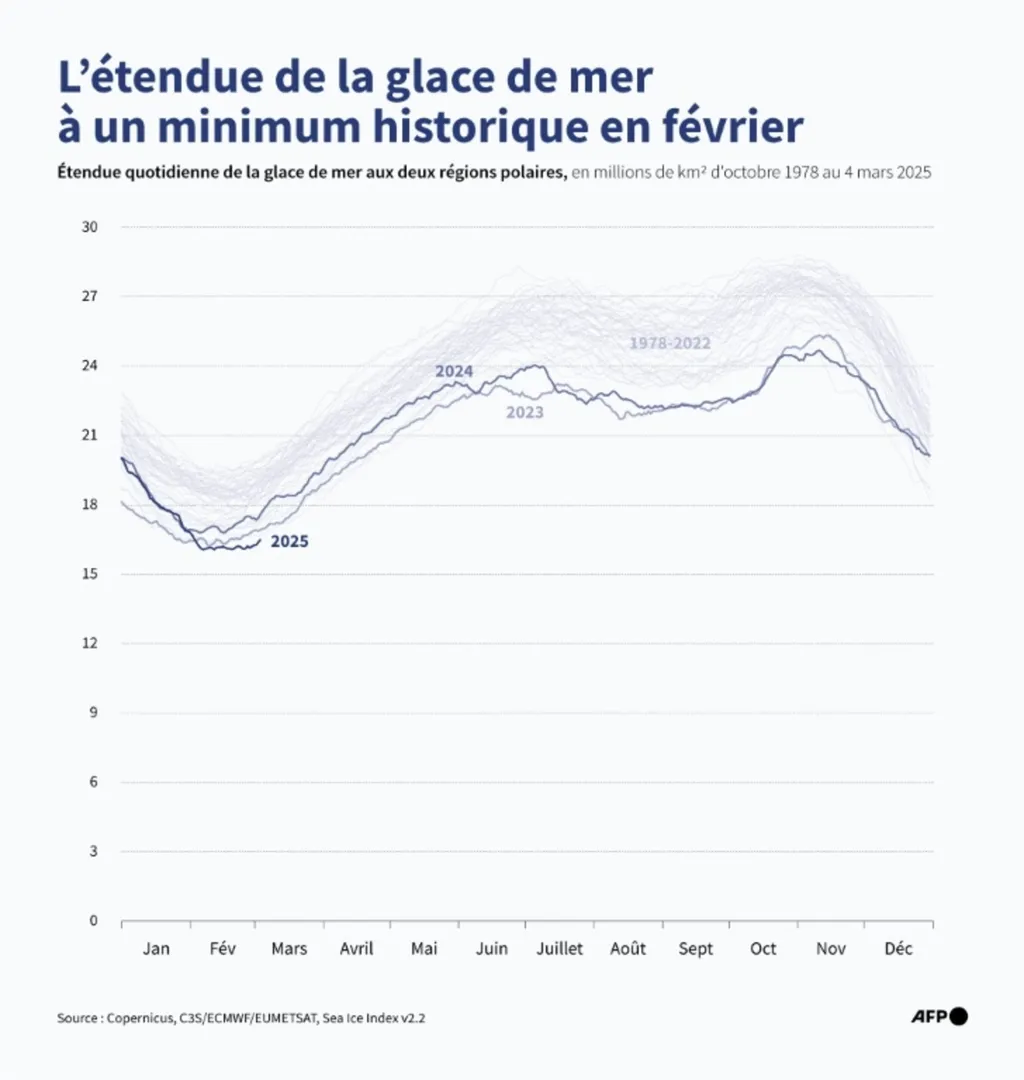 Son minimum annuel a été atteint le 1er mars et égalise ceux enregistrés en 2022 et 2024, soit les deuxièmes plus bas jamais enregistrés en 47 années de surveillance, a indiqué jeudi 6 mars le National Snow and Ice Data Center (NSIDC), un observatoire américain de référence.
