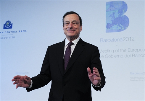 | Le président de la BCE, Mario Draghi, lors d’une conférence de presse, le 3 mai à Barcelone en Espagne |