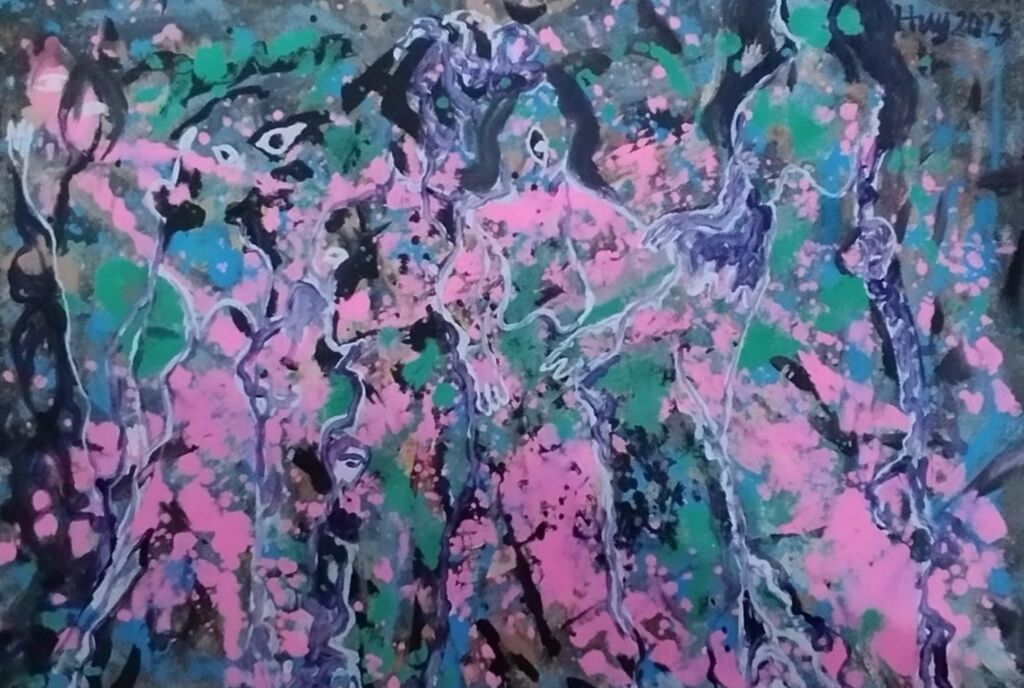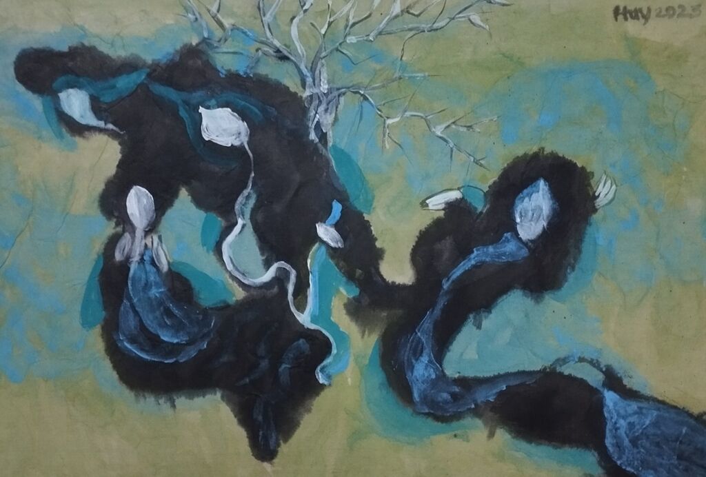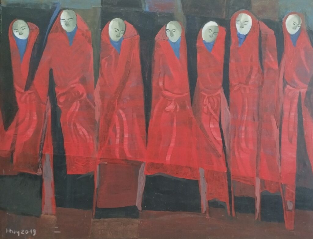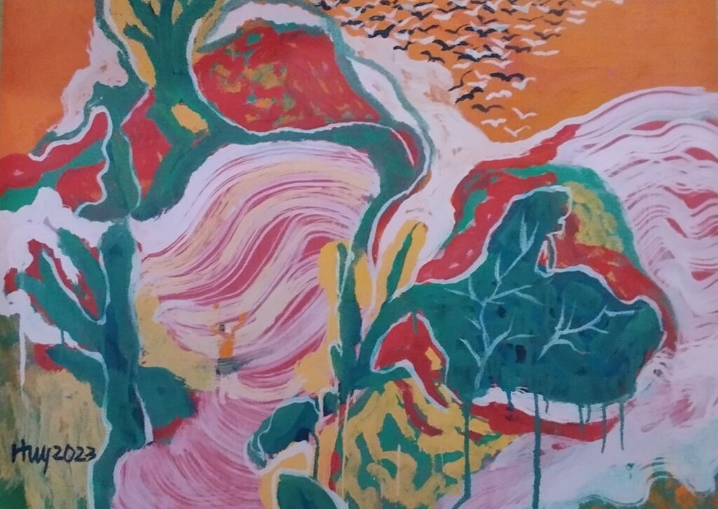 Ses œuvres aux couleurs profondes et aux lignes magiques se nomment : Relâcher le buffle, Sous le clair de lune, La rêveuse verte, Dans la tempête, Vieux toit, Subconscient, Hâu dông (rite religieux de la Déesse Mère, Ndlr) 2 et entre autres. Ses toiles expriment le flux du désir de vie et de l'amour humain. Huy offre ainsi au spectateur une rétrospective de son œuvre variée, riche de 35 ans de pratique depuis son diplôme de l'Université des beaux-arts du Vietnam.