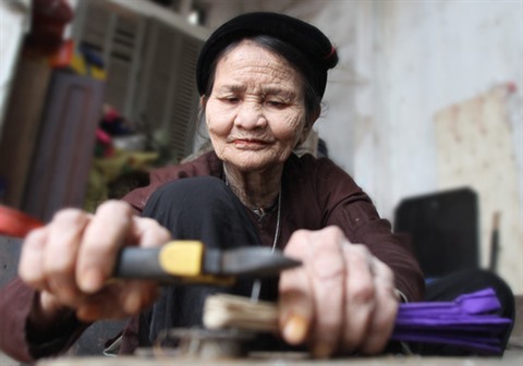 | Dô Thi Tinh, une artisane nonagénaire de Chàng Son, fabrique un éventail dit "quạt trổ". |