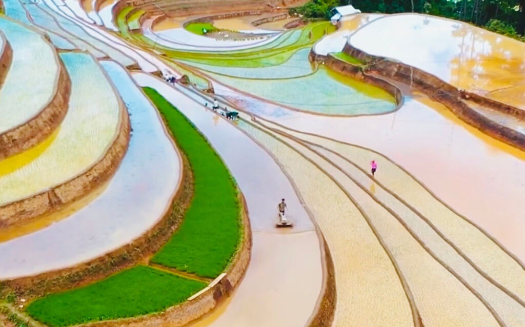 Entre mai et juin, Mù Cang Chai accueille ses premières averses d’été. Les H'mông commencent alors à conduire l’eau des hautes montagnes vers les champs pour préparer la nouvelle saison rizicole. L’eau se faufile entre les parcelles, créant un paysage impressionnant. La terre brune, l’eau transparente reflétant les nuages et le jeune riz vert clair constituent un tableau pittoresque captivant tous les regards.