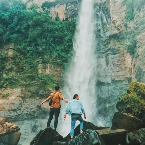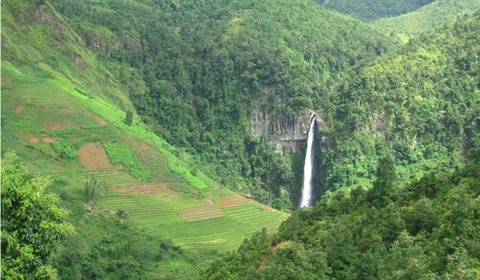 | Perchée à 1.800 m d’attitude, la chute d’eau de Hang Tê Cho s’allonge sur 50 m de hauteur |