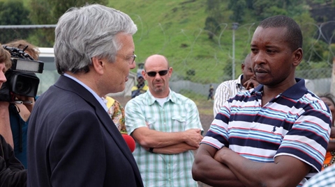 | Le vice-Premier ministre et ministre belge des Affaires étrangères, Didier Reynders (gauche), parle avec un ancien combattant à Kivu. |