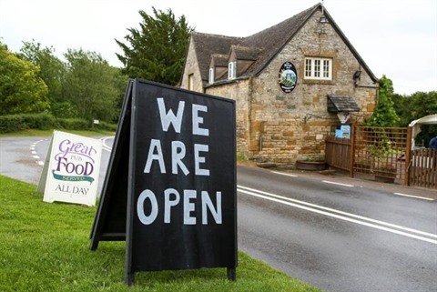 | "C'est ouvert", signale une pancarte devant le pub the Plough Inn à Ford, dans le centre de l'Angleterre, le 4 juillet, jour de réouverture des pubs dans le pays. |